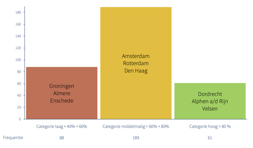 Dit geldt vooral voor de 88 laag scorende gemeenten, met als drie grootste: Groningen, Almere en Enschede. Ook de 189 middelmatig scorende gemeenten – waaronder de drie grootste gemeenten van ons land (Amsterdam, Rotterdam en Den Haag) – hebben vaak nog veel ruimte voor verbetering. Dat is in mindere mate het geval voor de 61 gemeenten met scores boven de 80 procent, zoals Dordrecht, Alphen aan den Rijn en Velsen.
